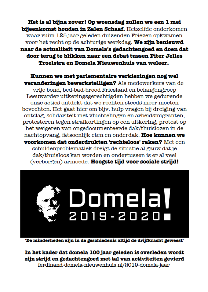 Met de 1 mei lezing over Domela willen we vooral het vrij socialisme benadrukken wat niet alleen een dagelijkse belangenstrijd was maar ook een vorm zelforganisatie, van sociale en culturele emancipatie. Domela was een van de grondleggers van het socialisme en de Sociaal-Democratische Bond die was ontstaan. De opkomende socialistische beweging was een sociale, culturele en morele gemeenschap. Autonome activiteit en zelfbewustzijn dienden de grondslag van de bevrijding te zijn, spontaniteit en organisatie combinerend. In deze beweging trok Domela vel van leer tegen het parlementarisme en het geloof in de staat. Er is veel voor te zeggen om de vroege, opkomende socialistische beweging als een coalitie van rivaliserende charismatische groepen te beschouwen. De oprichting van de Sociaal-Democratische Arbeiderspartij in 1894 was een reactie op het anti-parlementarisme in de Sociaal-Democratische Bond. Krachtiger dan in andere landen heeft de Nederlandse sociaaldemocratie zich gedistantieerd van alles wat zweemt naar ‘socialisme-vanonder-op’.